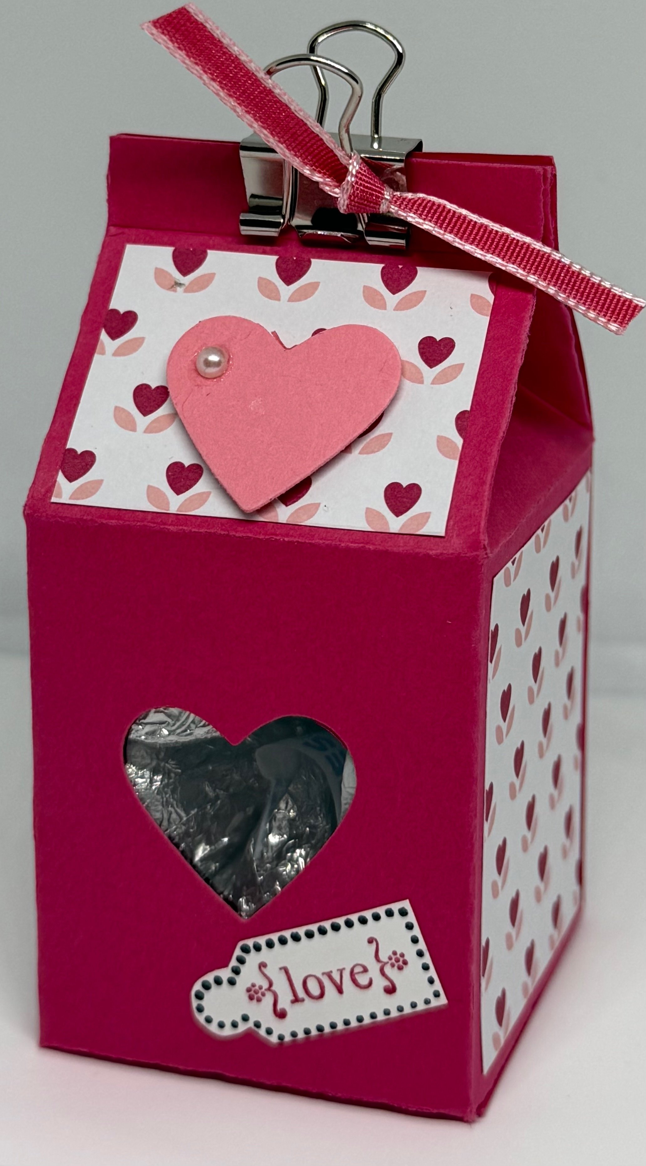 Valentine’s Day is coming up! here is an adorable little milk carton made for Valentine’s Day to hold a few Hershey kisses. It is so cute with the little punched out heart and then a window sheet put inside the carton so you can see the kisses.