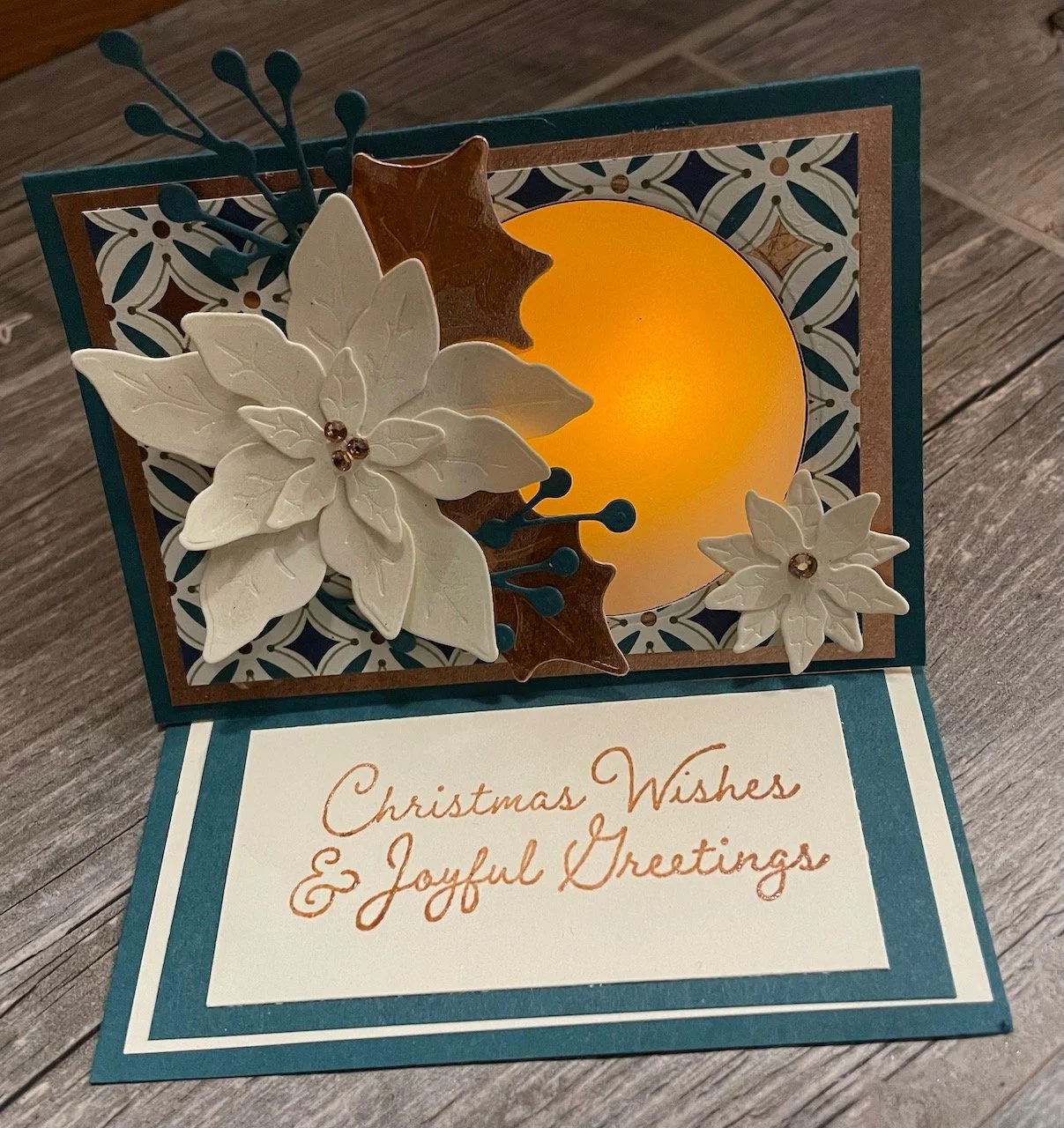 Annette - used Poinsettia Petals bundle. This card is truly a gift itself! There is a little tea light behind the poinsettia