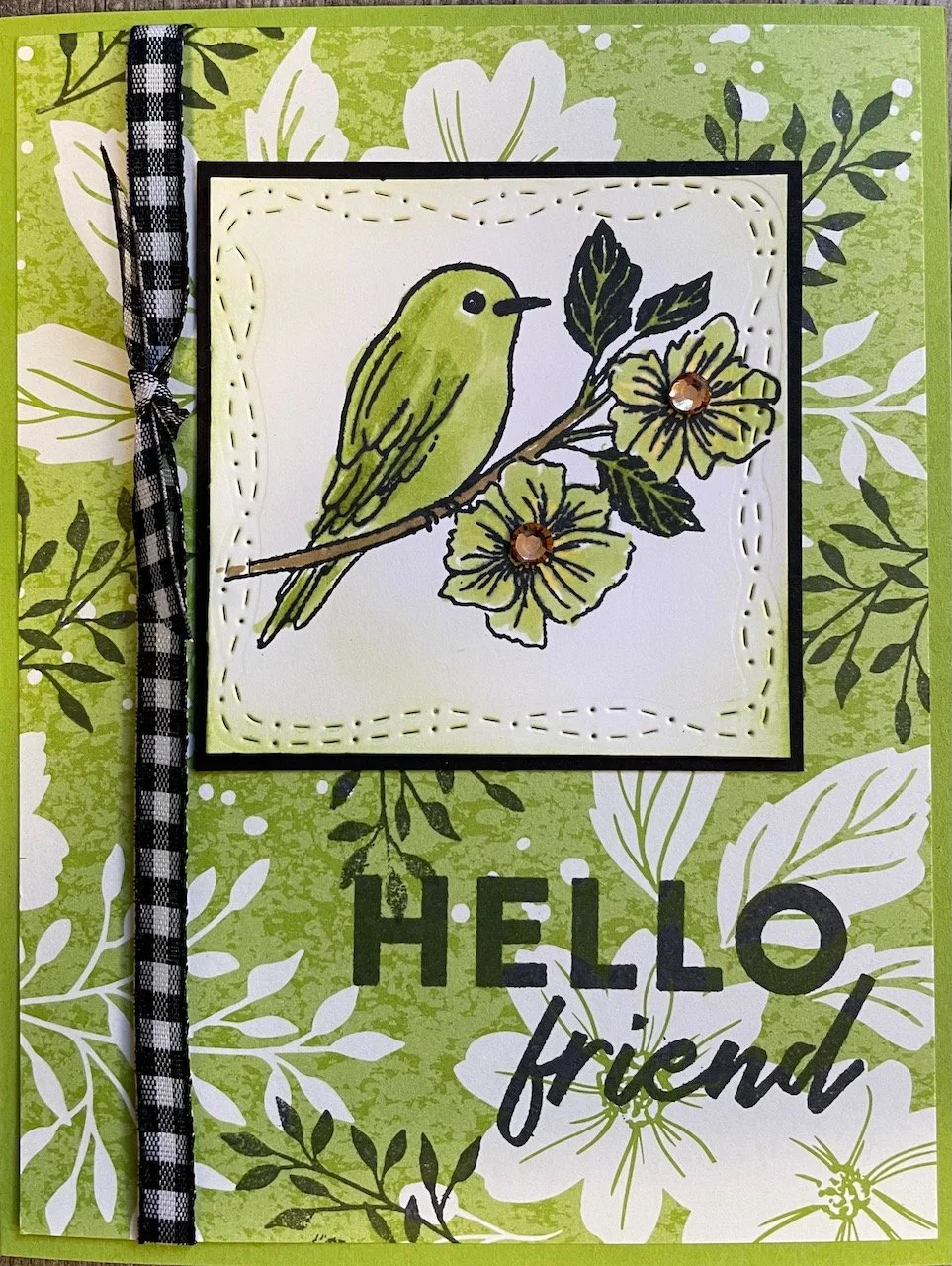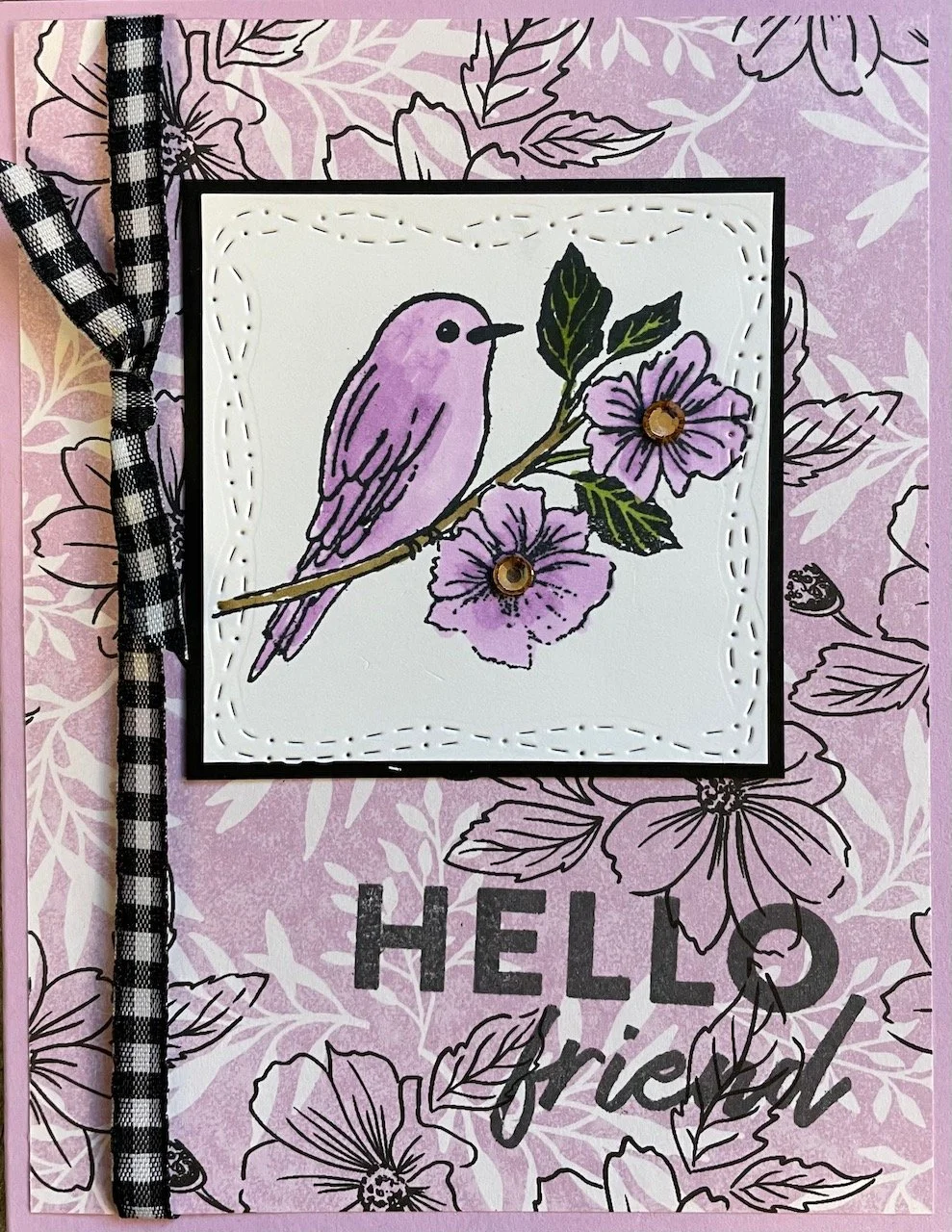 This week I wanted to focus of Friendly Hello stamp set and 12 x 12 Designer Series Paper…..it comes together FREE with a $100 purchase. I’ve been waiting to use it for our Birthday Stampin’ Blitze coming up February 26th! I love the card we’ve designed for Stampin’ Blitz with this set but thought I’d let you see a simple card I made today with it. You’ll see all the Birthday Stampin’ Blitz cards on February 27th here on the blog.