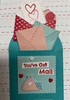 • Die cut a Scalloped Square in Pool Party from Layering Squares Dies for the “postage stamp” on the outside of mailbox so you have a plumb line for cutting a slit with your paper trimmer to insert the envelopes die cut form the envelope die in the Snail Mail Bundle.