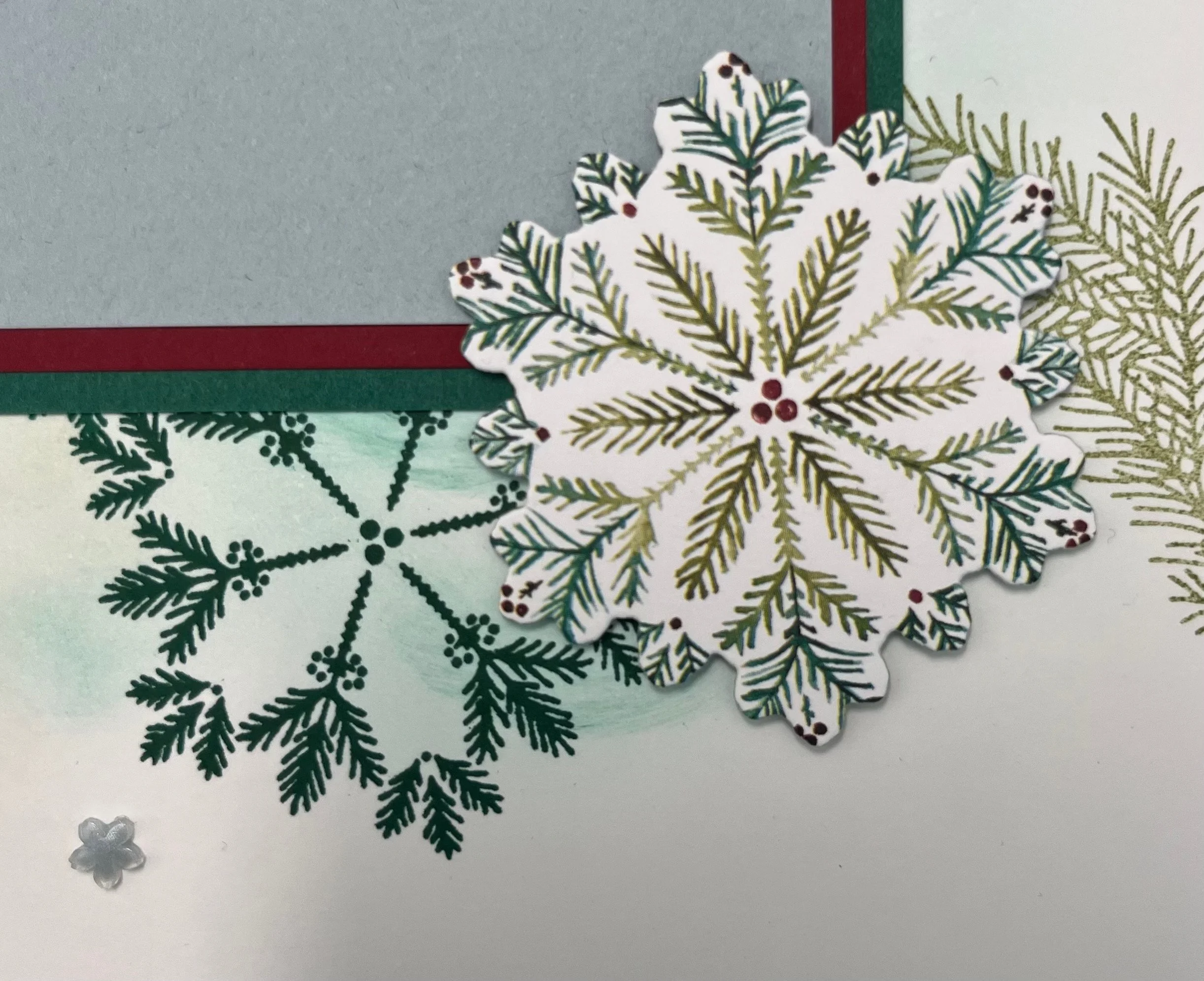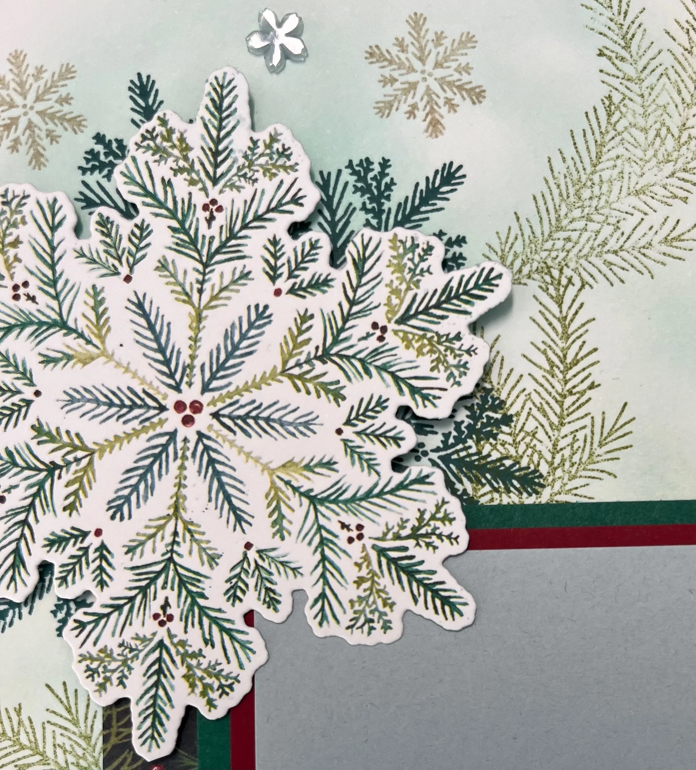 For this layout, I used Blending Brushes and applied LIGHTLY Shaded Spruce ink and Basic Beige ink and then started randomly stamping the snowflakes in Shaded Spruce, Pretty Peacock, and Crumb Cake.