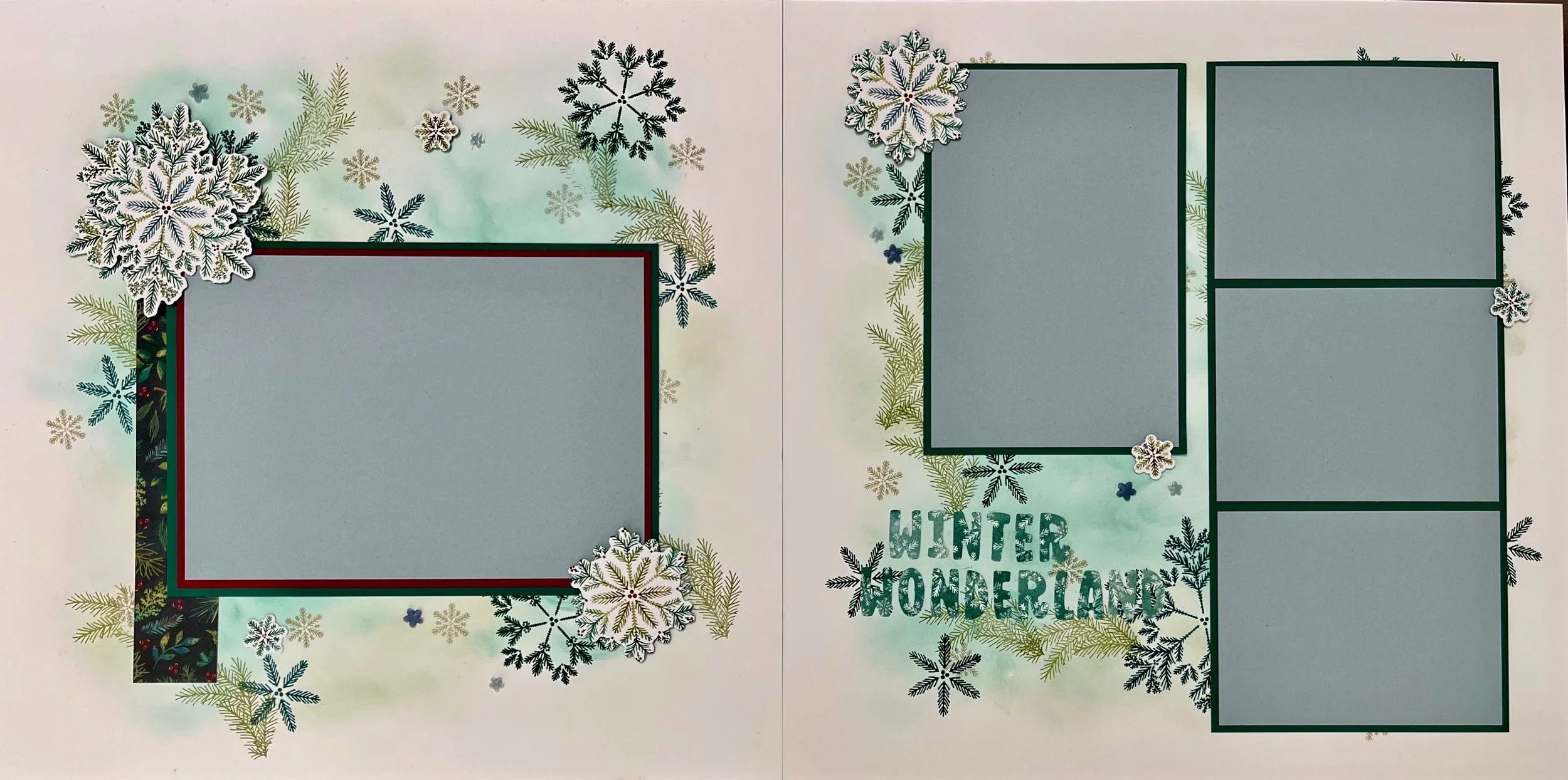 We also made the following scrapbook spread for winter pictures…..it’s kinda cold, kinda winter green an kinda Christmas….easy to create! What pictures would you put on this layout?