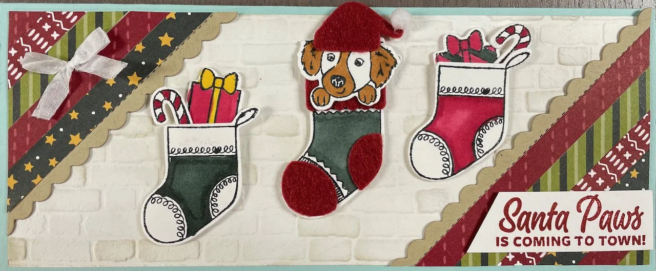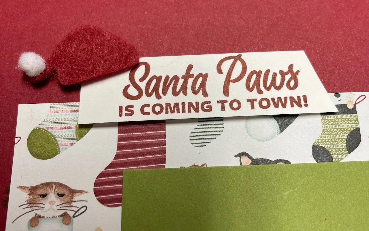 I invite you to join us scrapbooking….usually the 3rd Saturday of the month at 6pm at my home. Beginning January, two 2-page spreads are $20 plus free girl time with the ladies! Our other spread features the Sweet Stockings Designer Series Paper for your sweet paw prints in your life.