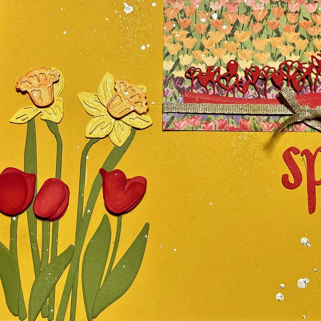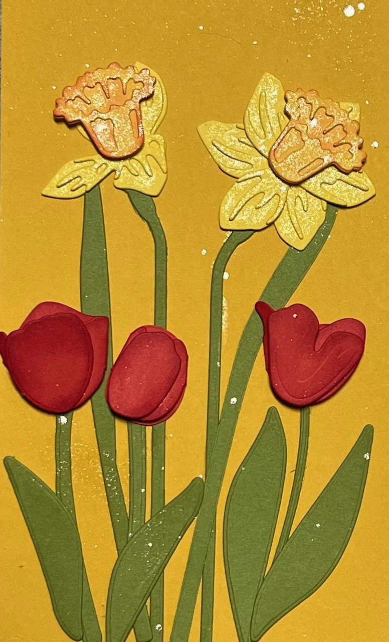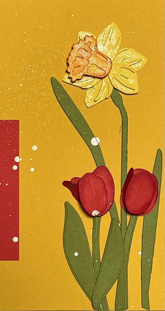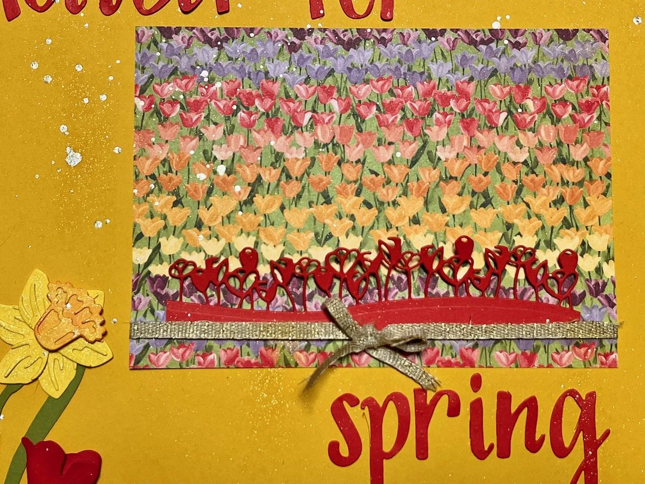 For this layout, I used both Flowering Tulips bundle and Daffodil Daydreams Bundle to make the flowers. I love how the tulips have so many dies and thus many different looks for the tulips! Not to mention….all the different colors of tulips too!