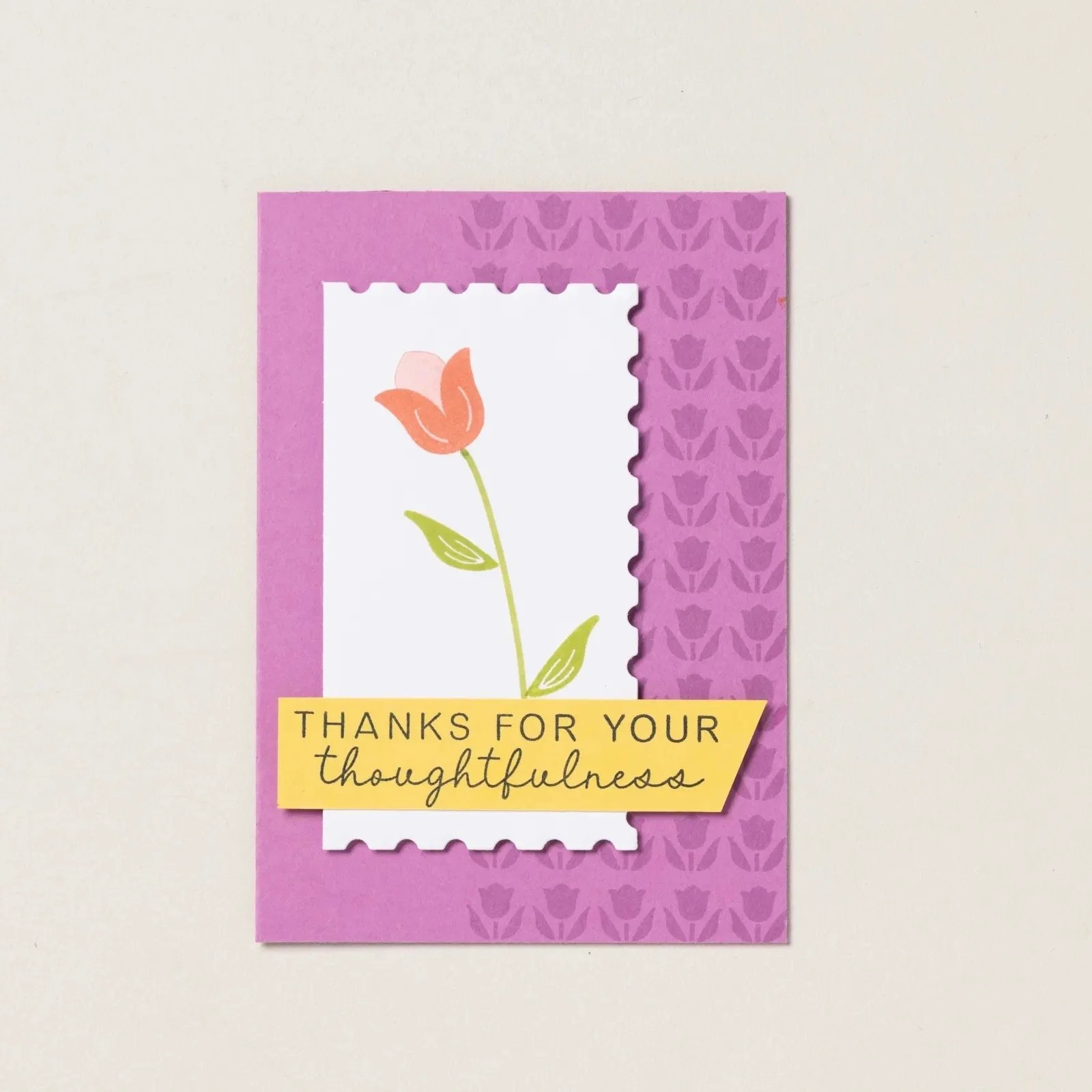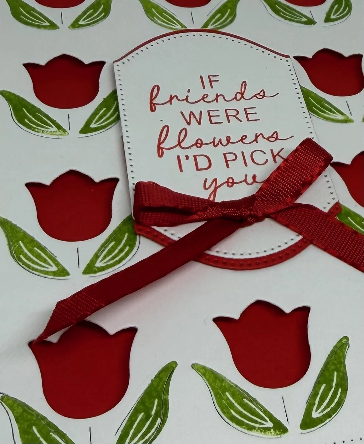 Attach the adhesive strips to a piece of red or yellow or pink or your favorite color of tulips piece of cardstock measuring 3 3/4” x 5”
