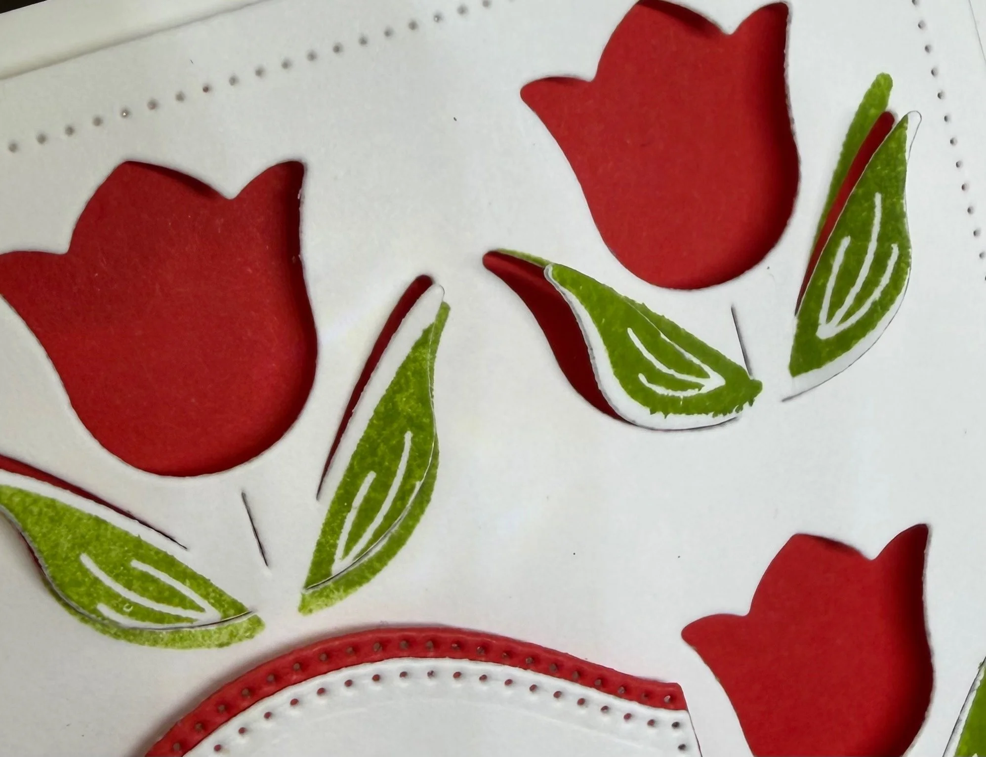 Continue with stamping leaves and using Adhesive Strips on the back of die cut tulip piece