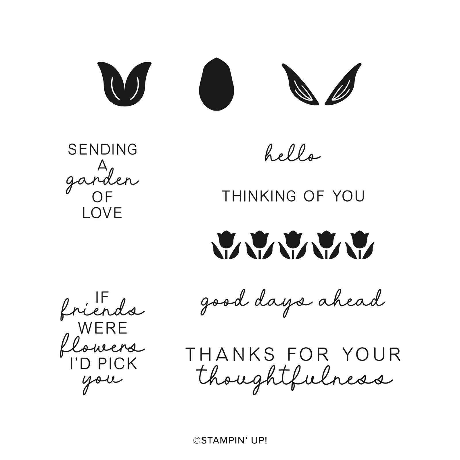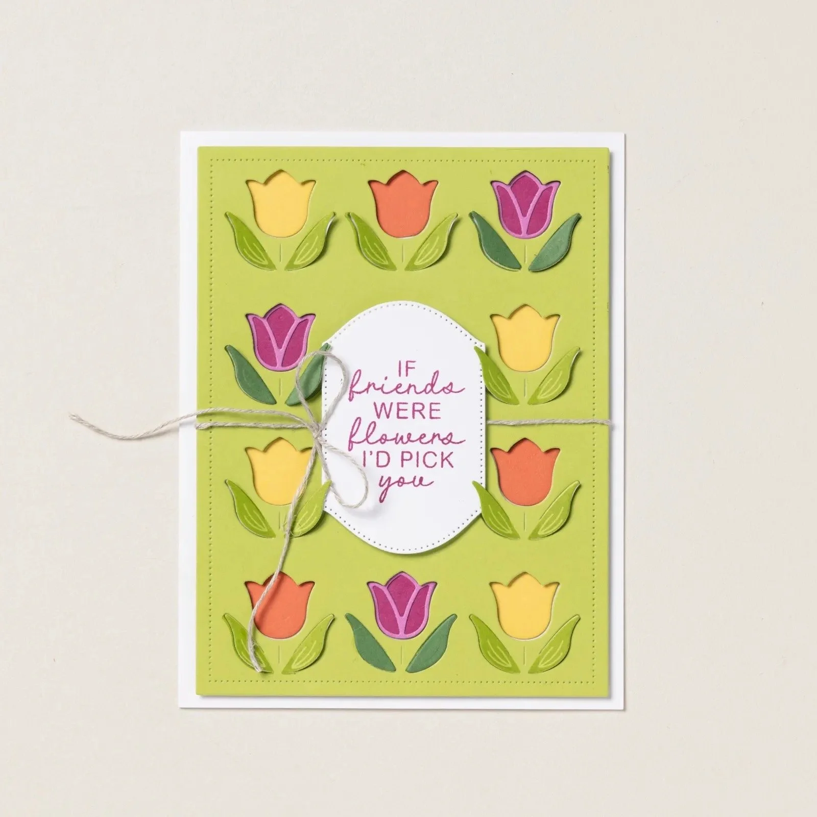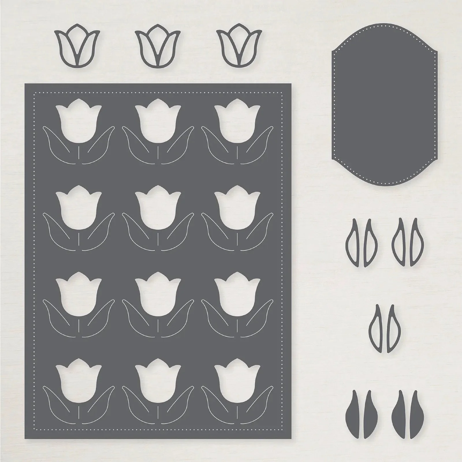 This is such a fantabulous stamp/die bundle! And so easy to use! Sunshine & Tulips is a stamp and die bundle that you’ll want on your wish list! The large die cuts out the 12 tulips and easily a pretty spring color of cardstock can be put behind the open tulips. I love using Adhesive Strips to elevate the die cut tulips!